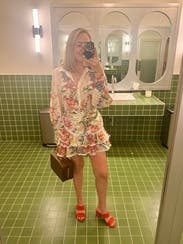 This was SO easy to style with different tops, shoes, etc. Makes it such a versatile skirt which is a must for me. I’ll totally buy it if it goes on sale, but def will rent again in the meantime! XS fit me perfectly & would still have stretch too. Length was just right & I wore it pretty high but if you want it longer just go up a size & wear it lower. Has a small lining underneath but I still wore mini bike shorts w pockets bc I always need pockets!