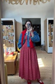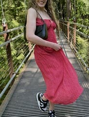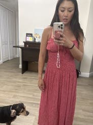 I thought this dress was really cute! I am really short at 4’11 so this dress pretty much hit the floor, but I did not mind! I was also able to shorten it a tiny bit by folding the top into itself and you couldn’t really tell. When i first tried it on the top was a little awkward on my chest but it’s adjustable so i was able to fix it and i think it looked just fine! Paired with a denim jacket since it was a little chilly. Felt great!