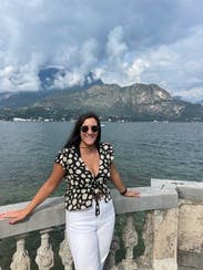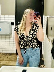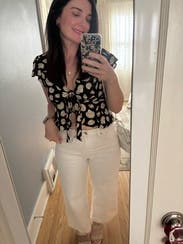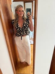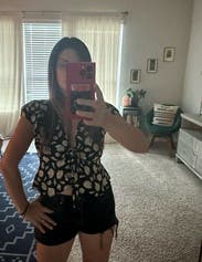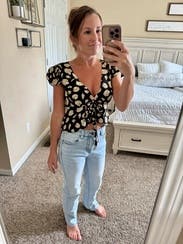 This top is super cute, but I would recommend sizing up. The material has no stretch, so it was a little hard to tie in the middle without showing more cleavage than I wanted. Otherwise, it’s a really fun and flattering style!