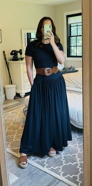Stretchy fabric, easy fit and a great way to register the drop waist trend. If you are shorter, expect maxi length.