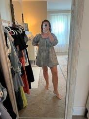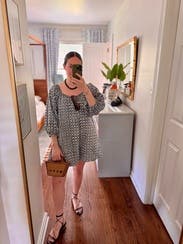 I recently had a baby so I’m leaning into loose items and this dress fit the bill! Im glad I took my usual size small as it was a touch short but I think the XS would have been too short. Rented in September/October as these colors are great for transitioning seasons if you live in a warmer climate. Follow mgm_styles on insta for more RTR reviews!