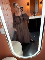 Found this romantic dress to be very flattering. It has the perfect combination of modest and romantic. The attached belt allows you to cinch in your waist a little bit while still being flowy. I’m 51 years old and typically wear a size medium and order this in a size small and it fit perfectly.