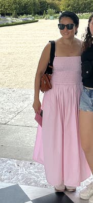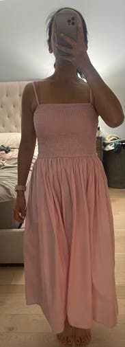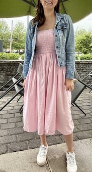 Basic summer dress in a cute pink color. Walked all over Versailles in this and didn't overheat in the August sun. Needs a slip though. I would think at this price point they would have a liner. It's a bit sheer in the sunlight. If you're wearing this in the evening you a get away with not wearing a slip. Bonus pockets!