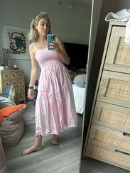 I absolutely loved this dress! It’s a beautiful color, the fabric is great for hot weather, and it’s a dress that you can dress up or down. I highly recommend it!