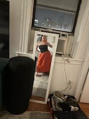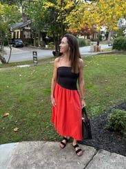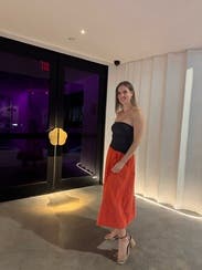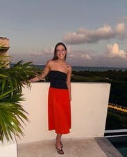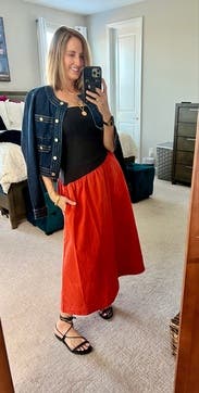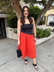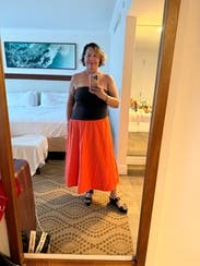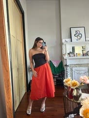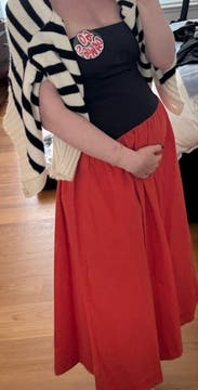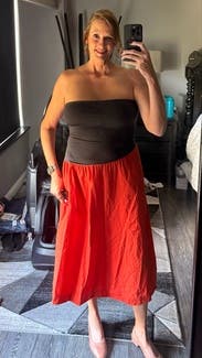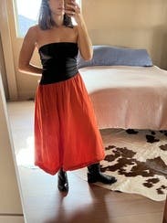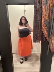 This is such a great style for all sorts of body types! A stretchy strapless top was cut at an angle to add interest to the full cotton skirt bottom. I did have to iron the skirt - so if you’re not that kind of care, this dress may not be right for you. I wore the dress to work w/a cropped denim jacket. Would definitely rent this again b/c of its versatility and pop of color.