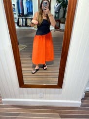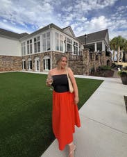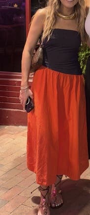 This vibrant two-tone dress by Ciao Lucia features a sleek strapless black bodice and a flowing orange midi skirt. It's perfect for making a bold statement at any summer gathering. Pair with strappy sandals and a clutch for a polished look.
