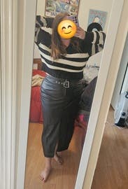 This sweater is short. Best to wear it with high waisted pants and/or a shirt underneath. It’s cute, but I found myself trying to pull it down a lot.
