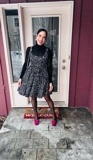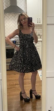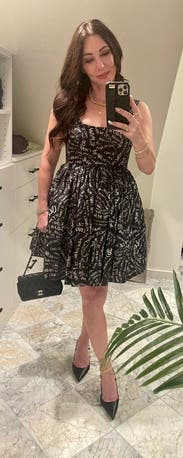 Wore this to NYE party calling for festive attire. Certainly festive! I decided to pair with a cardy cinched tight and short so I didn’t lose the waist line. I think this trick actually helped define my waist (since the dress waist is high, and my chest is smaller, certain angles gave me a little paunch). You could also try a wide belt if you have one that complements the dress. I’m more often a 6 or 8 though my height works well in a 4 or even 2. I was surprised I could squeeze into the 4 very well—I think because there’s nothing tight around the hips where I am fullest. I went with a super high shoe to amplify all that leg I was giving! My feet killed from dancing on a wood floor all night but so worth it. A mini dress is so far out of my comfort zone, but this one wasn’t going to sneak up my thighs without me noticing, that’s for sure. :) Many compliments all night.