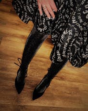I wore a belt to define the waist just below the top because it does tent out a bit. This gave me just the perfect amount of waist for a more flattering line. I wouldn’t have minded if it was a little shorter for the look- but I’m 5’4 so used to things being a little longer. Also if you don’t speak French, the words translate to “ I love you with all of my heart “ Wore to a black and white dinner. Lots of compliments.