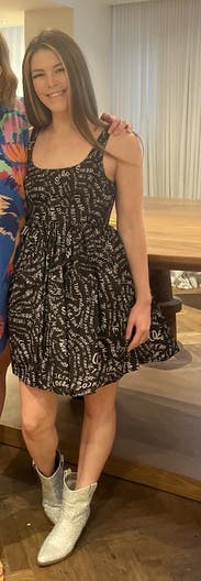 I am obsessed with this dress. Wore to Beyonce with rhinestone cowboy boots. The skirt has tulle that makes it really fluffy. Can't wait for an excuse to wear it again. It was a little loose in the waist, and a thin belt might have helped, but it wasn't noticeable.