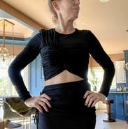 I loved this top. I rented it with the skirt, and if the skirt had fit better I probably would have purchased both. The set shows just a bit of midriff skin so was perfect for date night.