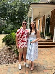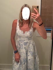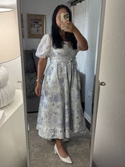 My sister and niece wore this last year at my grandmother's 100th birthday party. It evokes vintage china, which was something we associated with her. I rented as an option for Mother's Day, but went a different route. But I hate to waste a rental, so ended up wearing it to work. As the neckline does show cleavage, layered a white tank underneath and a cardigan on top. Received a few compliments. As several reviews have mentioned, the fabric is a heavier canvas and might be too hot for some on a day outside. But it was a great weight for the office.