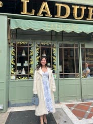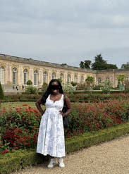 This A line dress is beautiful and so much fun to wear. The material is a little bit thicker & heavier but has elastic for comfort & stretch. I wore it with no bra & still felt completely secure. The toile baby blue pattern is adorable. I received so many compliments while wearing it on vacation in Paris. It works especially well for a larger bust without being too revealing & it fits beautifully on a petite frame. Highly recommend renting; it’s chic, playful & perfect for travel or special occasions.