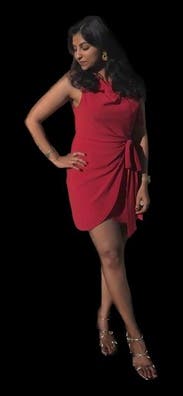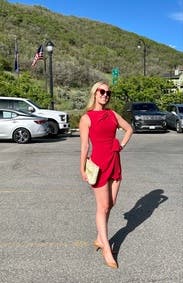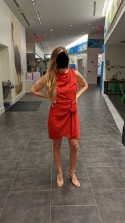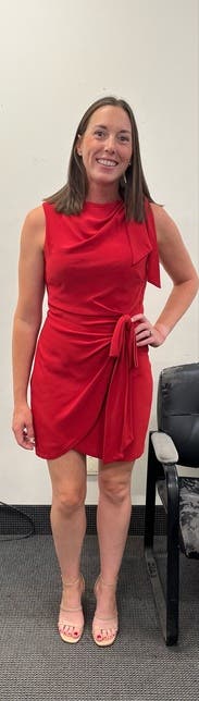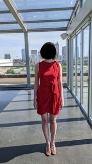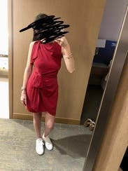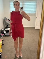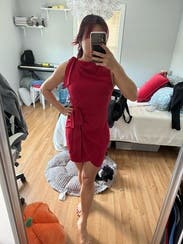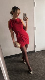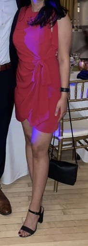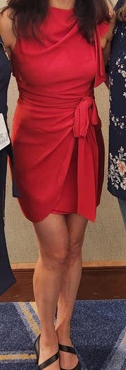 I wore it for a work event and received lots of compliments! It’s true red, a little on the short side, I’m 5’3 and don’t know if I would’ve felt comfortable wearing heels. I wore a strapless bra, I tried a regular bra but the straps kept showing. Definitely size up one size.. one size up for me was a snug fit but still comfortable. I ate a good bit and didn’t feel like the knot detail attracted attention to my belly, in fact I think it was a great distraction being on the side