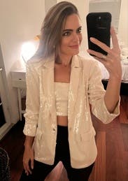 Ugh. I waited SO long for this top and the matching blazer to become available at the same time. I was excited to snap them up. However, this top has a deep flaw that made me return it without wearing. The sequins “wrap” over the top edge of the bodice, meaning they become mini razor blades and I could tell within seconds of putting this on that there’s no way I could wear it for an entire night. I am so disappointed considering the set is super high quality, the sequins are stitched on perfectly, and the set looks great together.