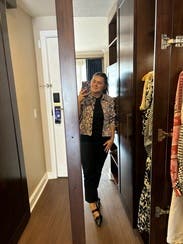 I didn’t wear it - did not fit like it did on the model - way too bulky - was disappointed as I wanted to take it on my trip