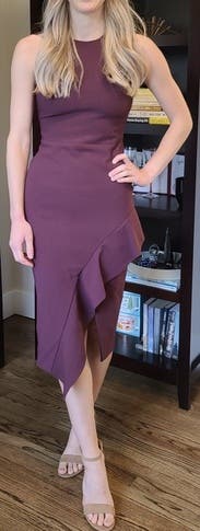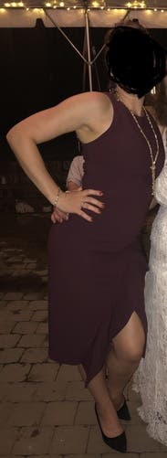 I was concerned it might be a bit too maroon but is a nice plum in person. Wore as a bridesmaid dress. Was a bit snug on the hips but found that there is a tiny bit of give so made it fine to sit and be comfortable overall throughout the day. Lots of compliments.