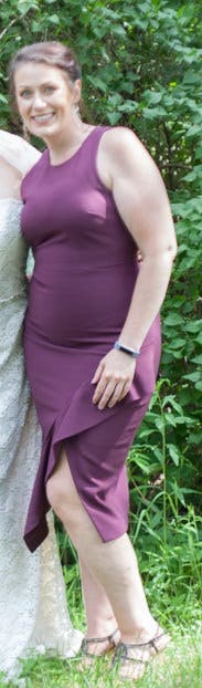 I wore this for an October wedding. I loved the color, slit, and classy high neckline and the dress was a high quality - structured and well made. I am a 34D and felt the top of the size 6 was a bit tight and hard to zip, even though I usually wear that size. Fit nicely through tummy and hips.