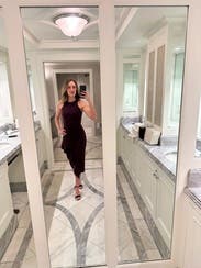 I tried both the 4 and the 6 as I’m usually between sizes. I couldn’t zip up the 4 unfortunately, I liked the length better on me than the 6. I am 5’5 with boobs and a butt, and a bit of a belly, so I usually shy away from fitted dressed like this but I really liked it! The dress was tight enough to go without a bra! 32E and just wore nipple covers.