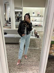 Wore w trouser jeans, white t, and heels. Jacket made the outfit effortless and chic.