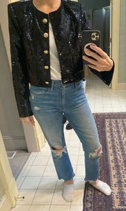 Loved this for a big work night that called for sparkles! I wore it twice actually: once with just one button buttoned like people are doing these days with cardigans, and then fully buttoned down, as shown here (and which I think I preferred more). The fit is definitely cropped but for me it was flattering.