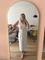One of my favorite brands and this dress did not disappoint. Great fabric, love the twist, and great length for my frame. The hook at the chest didn’t stay out and was low but I wore a camisole to fix that problem.