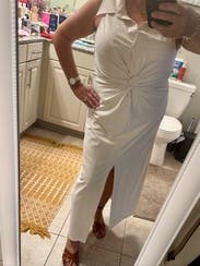 Love this dress I’ve never really worn anything close to white because I’m always afraid of getting stained on the outfit but this dress was perfect and I’m a petite and this dress came up to my ankles. Still felt fabulous. I most definitely recommend Shapeware that is seamless with this dress