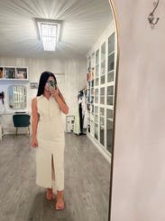 Fits in all the right places, extremely comfortable yet polished. I wore this multiple times, including a work dinner. The slit is front middle and requires a bit of navigating when taking a seat but overall is an elevated sophisticated and sexy vibe.
