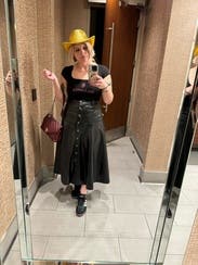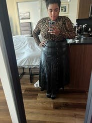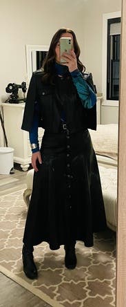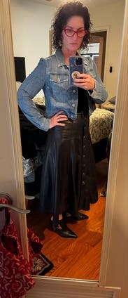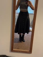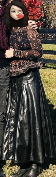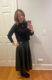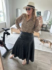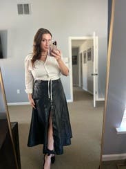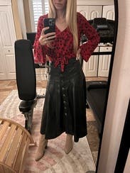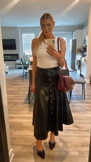 Loved the look of this leather A-line skirt—it’s super cute and well made—but I’ll admit, it was a bit tough to style. I kept it simple with a basic black bodysuit, which worked