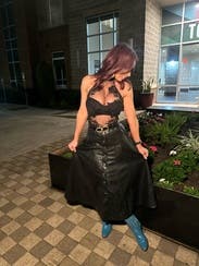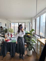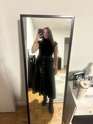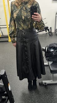 I liked the feeling of this pleather skirt. It's soft! The waist could have been a little more fitted for me, but it has belt loops. I loved the shape and would rent again.