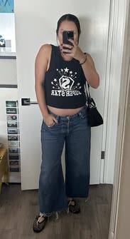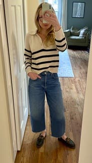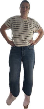 Order at least a size down and these will still be comfy! They are kind of boxy, but I reached for them because they are so comfortable. If you want a useful pair of jeans to throw on for bopping around town, rent these. They are boxy and cropped. If you are looking to dress these up, I would pivot to a different pair!!