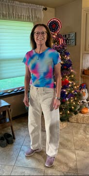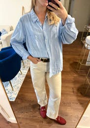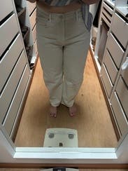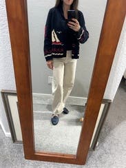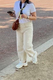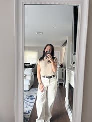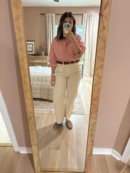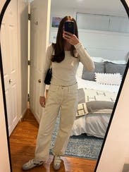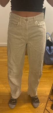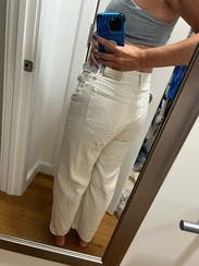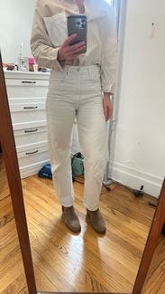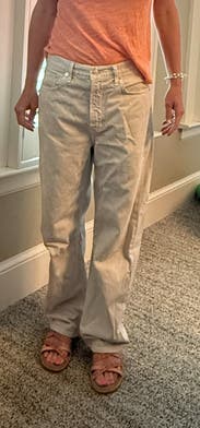 I really like this color that’s not super white but more of an off-white/light gray almost. I sized down to a 25 based on reviews (usually a 26), and they fit well even with my 5’3” frame. I just find that the waist stretches out during the day and legs can look wrinkled pretty easily. Otherwise, really like the color and subtle barrel leg