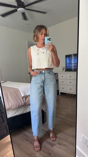 Super cute tank. Definitely an upgrade from a regular white tank. Fit very loose and cropped. Exactly what I was looking for. Paired it with a pair of high waisted pants. Might have bought it if it wasn’t so expensive