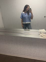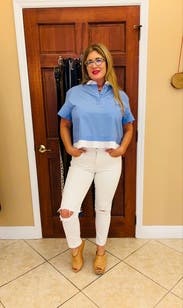 Love the gold buttons, white trim and beautiful blue shade of this cute top. It wasn’t the most flattering fit for my shape but I still really liked it. It looked super polished freshly steamed and made me feel very put together. I tried it on with a variety of different looks and it goes with everything from jeans to shorts and even a fancier skirt. Good choice for work too or a more conservative event.