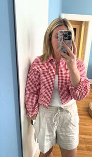 Lightweight jacket in a cutest gingham print. It was thin and perfect for summer. I probably would have gotten a larger size if they had it available but this worked out great! I paired it with the skirt would be cute on its own too.