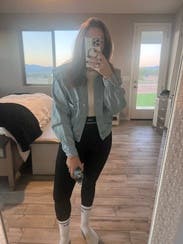 At first I wasn't sure what I thought of this jacket, but once I put it on, it definitely came to life. I recommend to wear it with a matching denim jean, that corresponds with it really well. I wore a small sports bra underneath it and left it open. This gave me more of a trendy upscale look. I did get a lot compliments on it. Just running around on vacation. I really liked how I styled it and felt that the matching gene made it pop. I don't think I would have liked it as much if I didn't have a coordinating matching jean of the same denim wash. That said, it was a cool piece and I did elect to keep it for the entire month rather than sending it back midmonth, like I normally would. Definitely. give it a try first fall coming up. It was a salad choice, although I probably wouldn't purchase it overall.