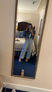 I am usually a medium but ordered a large because I wasn’t sure how this was going to fit and didn’t want it to be too small. I could have worn a medium. As you can see there was plenty of extra room. The large still worked though. If you don’t like statement sleeves, this shirt isn’t for you.