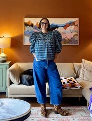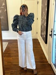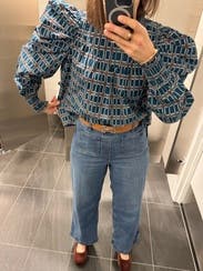 Cleobella’s Irina Blouse balances a mock ruffled neckline with pintuck detailing and puffed shoulders that gather into smocked cuffs for a structured, vintage-inspired silhouette. Style it with high-rise denim and a structured shoulder bag for a balanced, relaxed look.