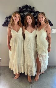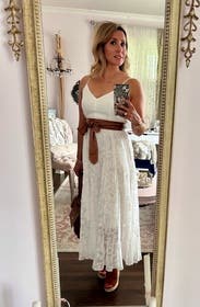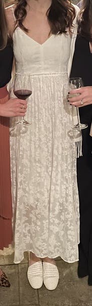 Wore to an all white wedding in Mexico. Very pretty, feminine dress. Loved the flower detail. Flowy and forgiving. Was very large/stretched out under my armpits but couldn’t really tell