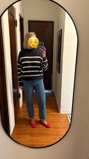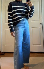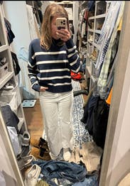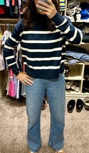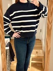 A perfect classic striped sweater, so comfortable. It's thick and warm but not bulky.