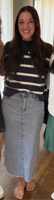 This looked great with just about everything. The sleeves were long enough which was great because sometime that can be an issue. Wore it with jeans once and a denim skirt the other time.