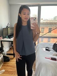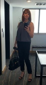 Wore this with some white pants to work. I liked the outfit overall, but due to my chest size, I felt like the front stuck out a lot. I got over it and thought it was a decent shirt that was something a little different. If you are a sweaty girl, this shirt will show it, so be aware of that.