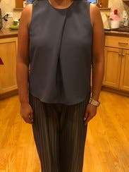 I have mixed feelings about this top. I love the beautiful and versatile slate blue color and the asymmetrical pleat. The fabric and construction are high-quality, with an inner lining. It looks classy and elegant, but I don't think it looks very flattering on me because the pleat makes it widen at the midsection. I tried tucking it in, but it didn't look right. It might be more flattering on someone with a different body type.