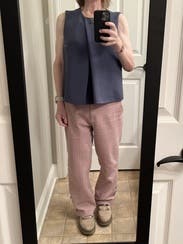 I would have bought this if it did not have to be dry cleaned. It is lined and high-quality. I appreciated that it was sleeveless but didn't show the aging parts near my under arms if you know what I mean. I liked the blue. Touch of gray.