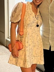 Work this to a baby shower and loved the fit and length. Dress is light weight, lined and has a subtle but luxe print. The neckline and button also gives some visual interest.