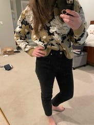 Liked this more than I expected. At first, I thought it was too big but it somehow fell into a flattering shape. Felt really cozy in it and loved the floral design.