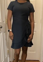 Pros: great fit, cute and flattering cut Cons: short in front where it opens Loved this dress. Definitelyyy too short for the office, but okay for after work rooftop event (always wearing little shorts under bc stairs) as long as you don't pick your arms up over your head! I pinned the front lining together to keep it from flapping open in the wind but on a not-so-windy day, it's just short.