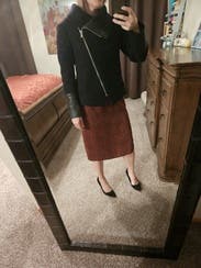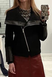 Fit & Feel: This jacket fit perfectly and added just the right amount of structure and polish to my outfit. It’s form-fitting without being restrictive, and the zipper detail makes it easy to style open or closed. I ended up wearing it zipped for a sleeker look — it also provided a bit more coverage with my dress, which made me feel comfortable and confident all night. Style Notes: The black fabric pairs beautifully with sparkly or statement pieces. It has a slightly edgy, moto-inspired feel that dresses down sequins just enough for a matinee or dinner date while still feeling chic. The cut is flattering at the waist and gives great shape. Overall: A versatile, stylish layer that elevates almost any look. Perfect for pairing with a more daring dress or adding sophistication to a casual outfit. I’d absolutely rent this again — it’s that rare piece that feels both cool and classic.