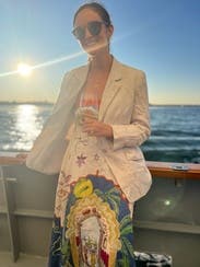 Loved this blazer, and ended up purchasing it. It was the perfect color and weight for my mid-October trip to Lake Como. Weather was mid-60s each day and I paired this with dresses, jeans, and jumpsuits. It is lined but still lightweight. It kept me warm on our boat day but was cool enough to keep on in the sun without a breeze. It’s a great length and checks all my boxes!
