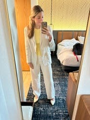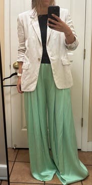 This is a good blazer for warm weather. I’m glad I sized down with the XS, it fit just right. Shoulder pads are nice. It doesn’t feel or look like the highest quality blazer but it’s cute and I would rent again. I was able to wear without steaming it knowing it would wrinkle easily anyway.